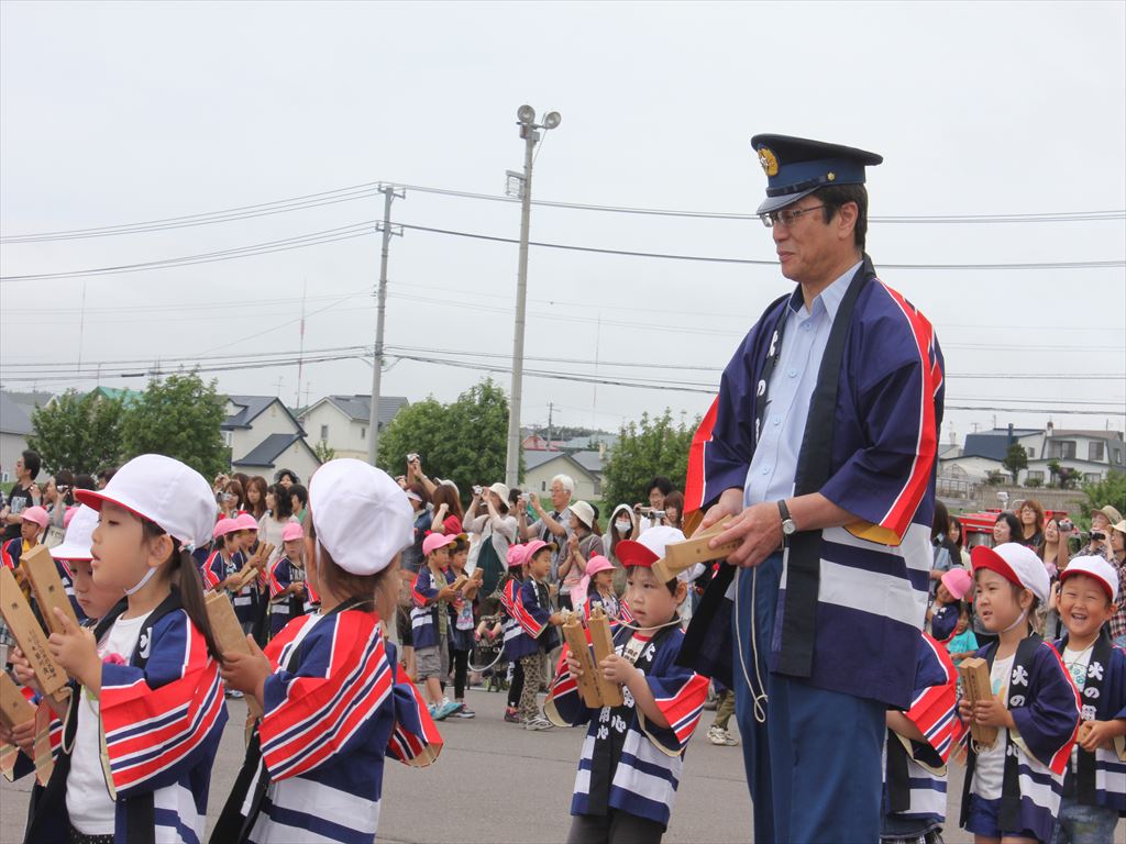 午前10時からの「幼年消防クラブ防火パレード」では市内4幼稚園の園児達が参加し、音楽と先生の号令に合わせながら鼓笛演奏を披露してくれました。来場者は鼓笛演奏や音楽に合わせて踊る姿に盛んに拍手や声援を送っていました。その後、お揃いの法被に着替えた園児達は拍子木を打ちながらパレードを行い、来場者に「火の用心」を呼びかけました。 午後からの「市民と子どもの消防ふれあい広場」ではスタンプラリー方式ではしご車の体験搭乗など、各種消防ブースを体験してもらい、集めたスタンプに応じて景品を獲得したり、エアー遊具や軽食コーナーに長蛇の列ができるなど賑わいを見せていました。また、会場には網走のゆるキャラ「ニポネ」が登場し、一緒にピースサインをしながら記念写真に収まるなど、多くの来場者の皆さんに楽しんでいただける消防イベントとなりました。