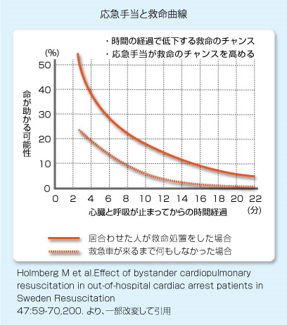 心臓が止まってしまうような重大な事故は、いつ、どこで、何が原因で起こるか分かりません。心臓と呼吸が止まってから時間の経過とともに救命の可能性は急激に低下しますが、心肺蘇生やAED(自動体外式除細動器)などの応急手当を行えば、救命の可能性はおよそ2倍になることが分かっています。