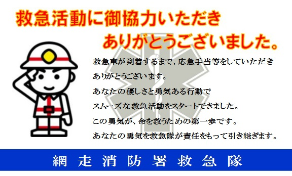 そこで網走消防署では、令和元年9月9日(救急の日)から、救急隊が救急現場に到着するまでの間、応急手当をしていただいたバイスタンダーの勇気ある行動に対して感謝の意を表すために「バイスタンダー感謝カード」を救急現場でお渡しすることとしました。
