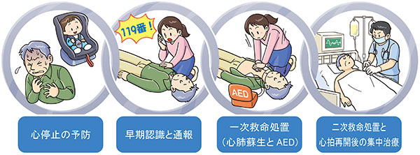 病気や事故で急変した人を救命し、社会復帰させるために必要な一連の流れを「救命の連鎖」といいます。救命の連鎖を構成する4つの輪が素早くつながると救命効果が高まります。鎖の1つ目の輪は「心停止の予防」、2つ目の輪は「心停止の早期認識と通報」、3つ目の輪は「一時救命処置(心肺蘇生とAED)」、4つ目の輪は救急救命士や医師による高度な救命治療を意味する。「二次救命処置と心拍再開後の集中治療」です。