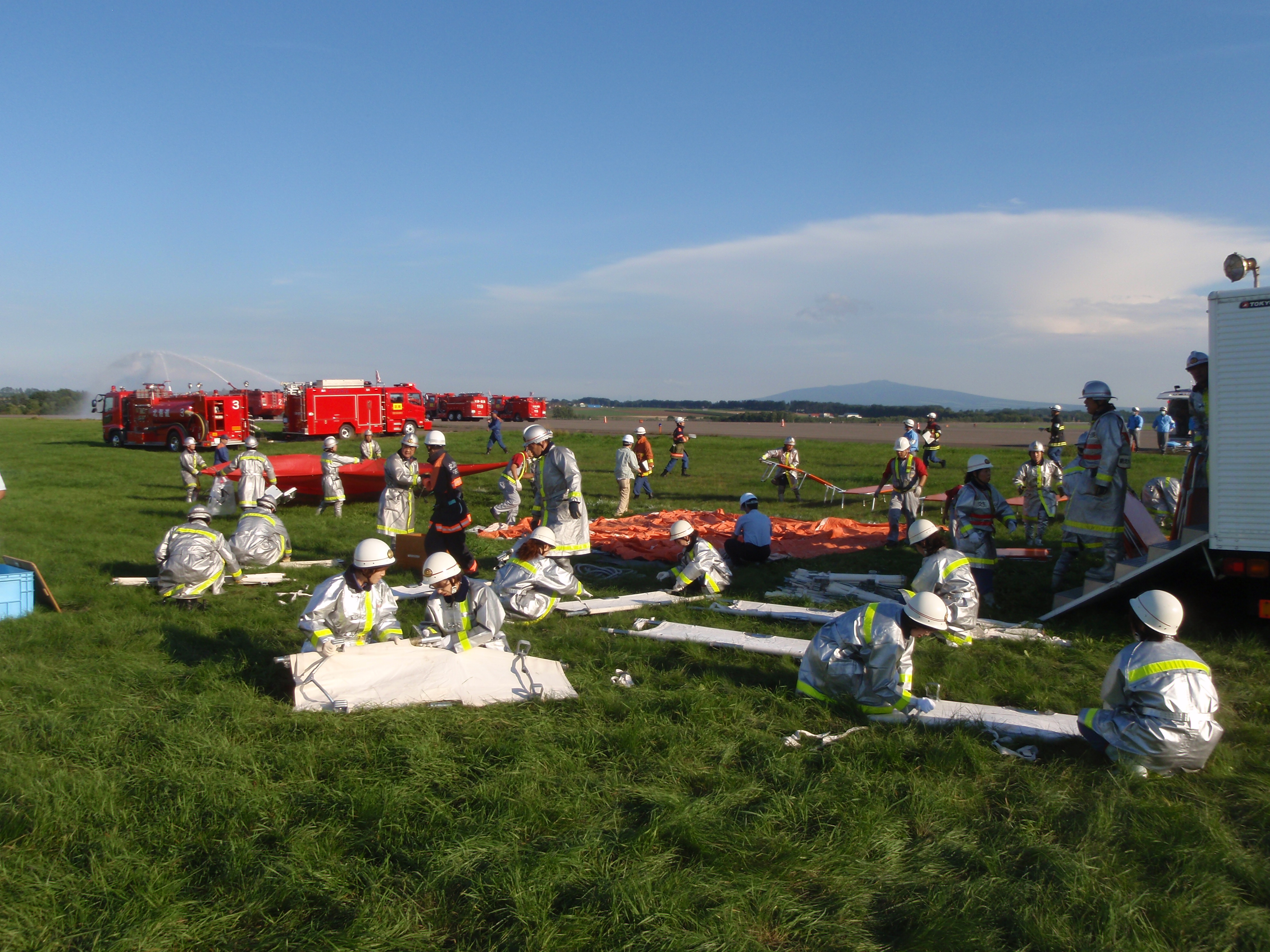 今年も女満別空港で航空機の災害を想定した訓練『平成25年度女満別空港消火救難総合訓練』が9月10日(火)に実施されました。 この訓練は、消防・警察・自衛隊医療機関など30の団体約290人が参加し、実災害に備え各機関の対応及び連携を確認するために毎年行われています。 大型バスを事故機に見立て着陸後の炎上を想定し、通報連絡体制の確認訓練、化学車による泡消火訓練、自力で脱出してきた負傷者を一時的に避難させ応急処置を行い、医療機関へ搬送する救護救難訓練、機内に残された人を救出する救助訓練などが総合的に行われました。