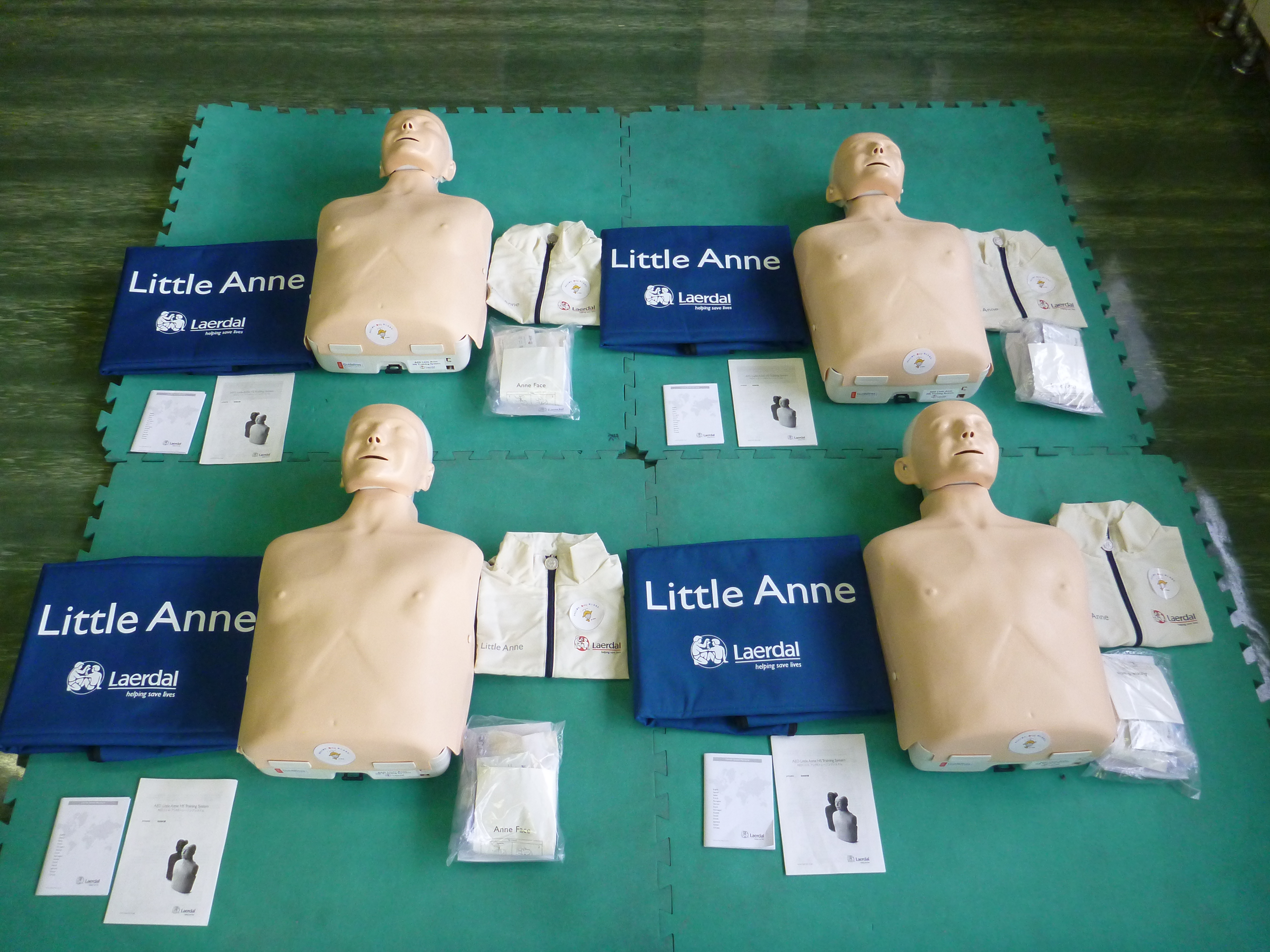網走消防署では、地域住民及び自主防災組織員等に対する更なる応急手当普及を目的として、(財)自治総合センターの平成25年度コミュニティ助成事業「地域防災組織育成事業」を活用し、心肺蘇生訓練用マネキンセット・AEDトレーナー等の応急手当訓練資器材を宝くじの助成金で整備しました。 |