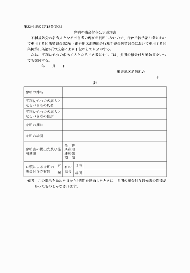 2 行政庁が法第15条第3項又は条例第15条第3項の規定による掲示(以下「聴聞の掲示」という。)をするときは、聴聞公示通知書(第2号様式)を掲示場(網走地区消防組合公告式条例(昭和46年条例第20号)第2条第2項に定める掲示場をいう。以下同じ。)に掲示して行うものとする。