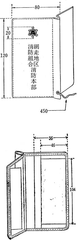 消防手帳 | 表紙は、黒色の革製又はこれに類似するものとする。 中央上部に消防章を、その下に消防本部名を、それぞれ金色で表示し、背部に鉛筆差しを設け、その下端に長さ45センチメートルの黒色ひもをつけ、表紙内側には、名刺入れをつける。 用紙は、恒久用紙と記載用紙とに分け、いずれも差し換え式とし、その枚数は、恒久用紙10枚、記載用紙80枚とする。 形状及び寸法は、図のとおりとする。 | ||||