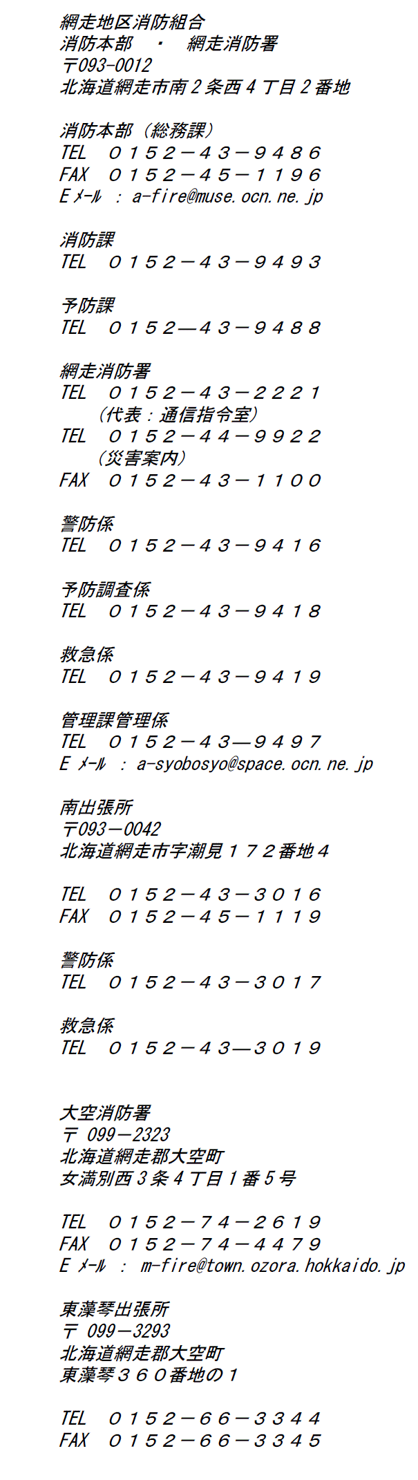 係る変更申請について 8 3.17 網 走地区消防組合競争入札参加資 格者名簿(物品調達・役務提 供)について 8 3.11 冬 季藻琴山救助訓練を実施! 8 2.27 網 走市少年消防クラブ冬季学習会 を実施しました 8 2.2 公 表該当違反対象物について 8 1.5 新 年のご挨拶 |